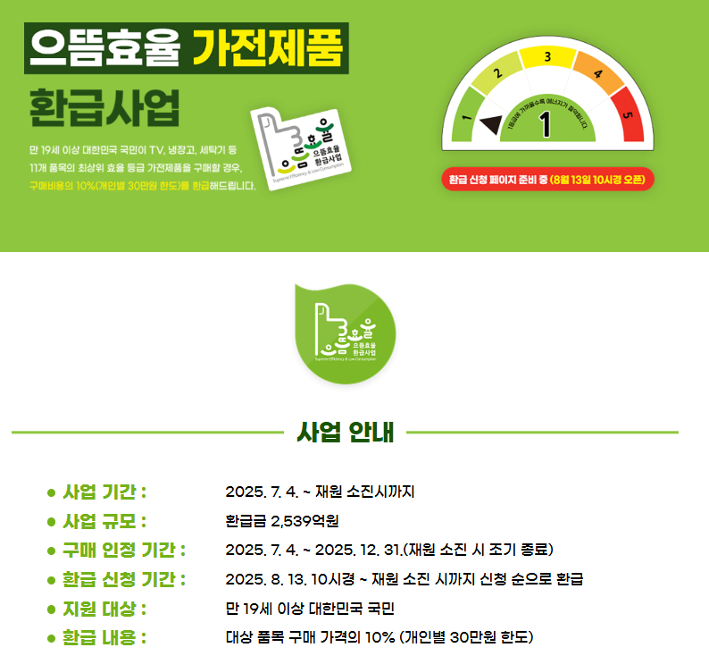 - 으뜸효율 가전제품 환급사업 (환급 신청 페이지는 준비중 - 8/13 10:00 오픈예정)